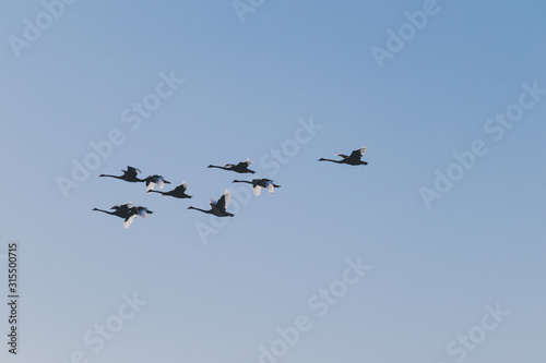 © faithie, Obraz premium flock of black swans flying or migrating to another place