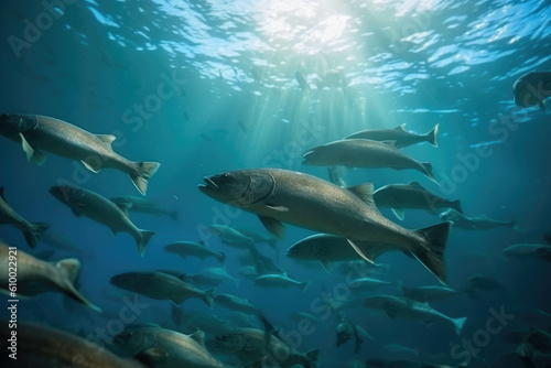 Fototapeta premium Flock of catfish sea ecosystem in the ocean underwater background school of small fish. AI