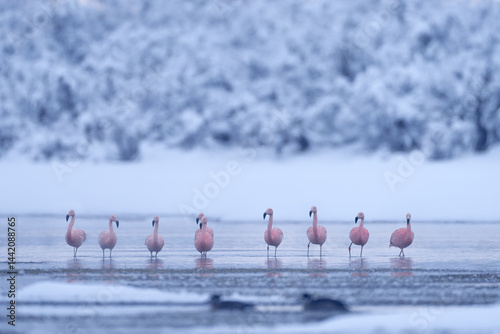 © ondrejprosicky, Fototapeta premium Flock of Chilean flamingos, Phoenicopterus chilensis, nice pink big birds with long necks, dancing in water, animals in the nature habitat in Chile, America. Flamngo from Patagonia, Torres del Paine.