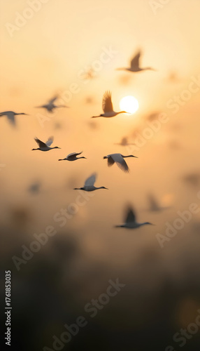 © PixArt, Obraz premium Flock of Cranes Flying at Sunset in a Serene Golden Sky Over the Horizon