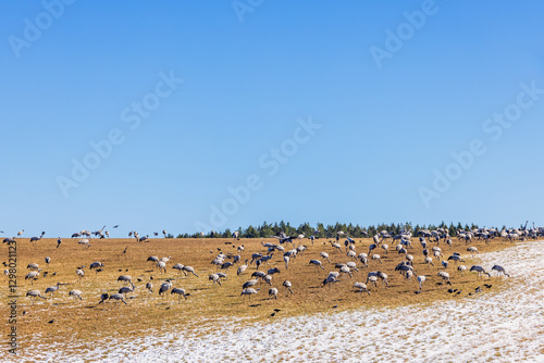 © Lars Johansson, Fototapeta premium Flock of cranes foraging on a hill with snow at spring