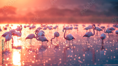 Naklejka premium Flock of flamingos wading in Lake Nakuru at sunset, Kenya. The vibrant colors of the sunset illuminate the scene, creating a magical atmosphere with the reflections on the water.