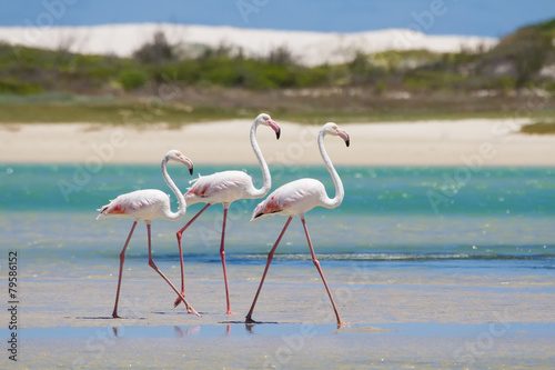 Obraz premium Flock of flamingos wading in shallow lagoon water