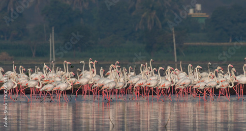 Naklejka premium Flock of Greater Flamingos with their pink reflection in the waters at Bhigwan in Maharashtra, India