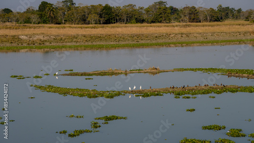 © Bhaskar, Naklejka premium Flock of Lesser Whistling Ducks or Dendrocygna javanica also known as Indian Whistling ducks and Egret at Kaziranga National Park wetland wide shot