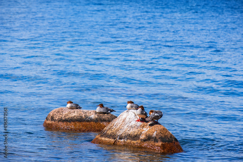 © Lars Johansson, Fototapeta premium Flock of Merganser birds on a rock in a lake
