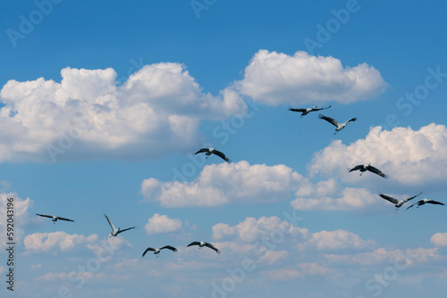 © Elena, Obraz premium Flock of migrating Grey herons in the sky