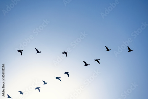 Fototapeta premium Flock of migratory geese flying in v formation on a blue sunny sky