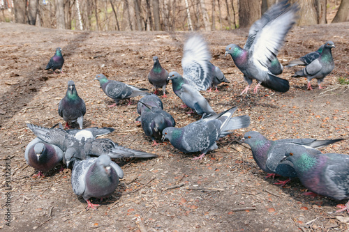 © andiafaith, Obraz premium Flock of pigeons eating in the park
