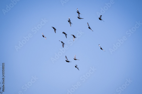 Obraz premium Flock of pigeons flying in the sky