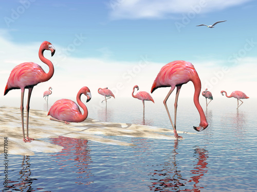 © Elenarts, Obraz premium Flock of pink flamingos - 3D render