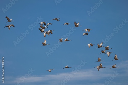 Obraz premium Flock of Sandhill cranes, Grus canadensis flying high in the blue cloudless sky