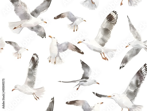 © Natanong, Fototapeta premium Flock of Seagulls Gracefully Soaring Against a Pristine White Background
