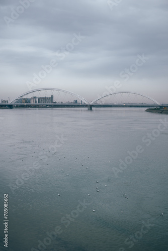 Naklejka premium Flock of seagulls in Danube river in Novi Sad on cold winter day