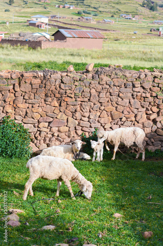 © ruslanita, Obraz premium Flock of sheep and newborn lamb in the countryside.