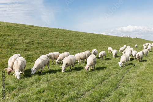 Fototapeta premium Flock of sheep grazing along a Dutch dike