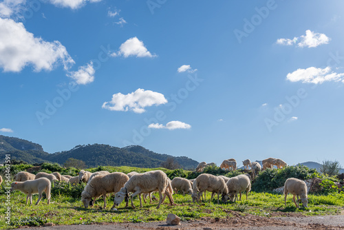 © Nemesio, Obraz premium Flock of sheep grazing in a green meadow