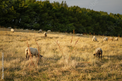 © Вікторія Імбер, Obraz premium Flock of Sheep Grazing on Mountain Pasture in Summer