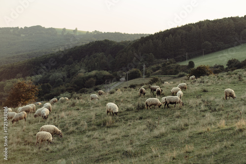 © Вікторія Імбер, Fototapeta premium Flock of Sheep Grazing on Mountain Pasture in Summer
