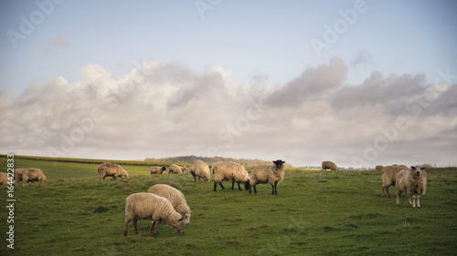 © veneratio, Fototapeta premium Flock of sheep in Spring sunshine in English farm countryside landscape