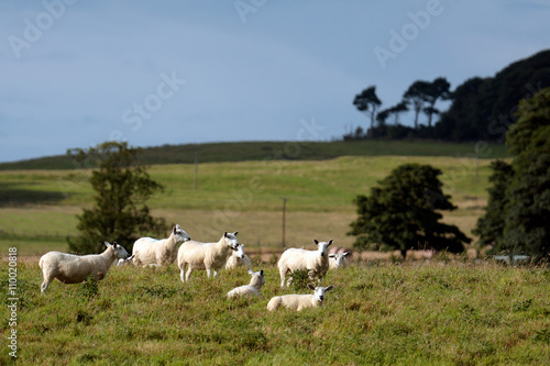 Fototapeta premium Flock of sheep on a hillside near Alnwick Norhumberland