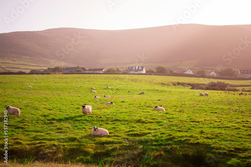 © AndreyesArt©, Fototapeta premium Flock of sheep on green grass on a warm Irish dawn. Houses in the background.