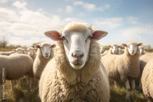Obraz premium Flock of sheeps standing on the farm bokeh style background