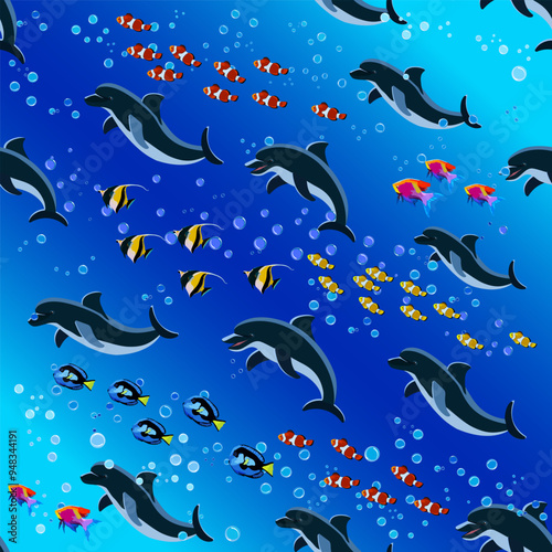 © Инна Федорова, Obraz premium Flocks of dolphins and fish.Color vector pattern with dolphins and flocks of bright fish.