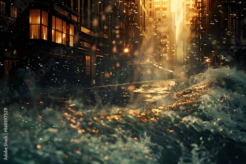 © andyaziz6, Fototapeta premium Flooded City Street at Sunset. Dramatic Image of Climate Change Impact