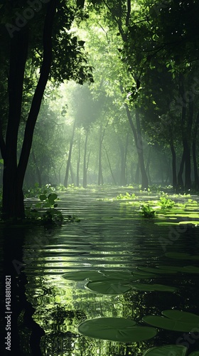 © DeepView, Obraz premium Flooded Forest Path with Lily Pads