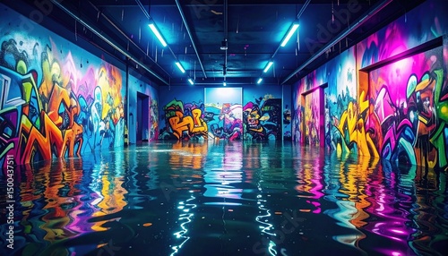 © jumino, Naklejka premium Flooded Graffiti Tunnel with Neon Lights.