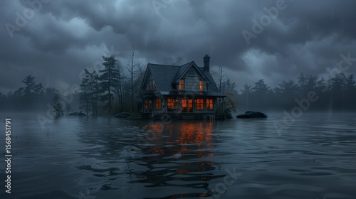 Fototapeta premium Flooded house glows orange against a dark, overcast, waterlogged landscape