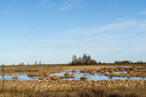 © olandsfokus, Fototapeta premium Flooded landscape by an old dry stone wall