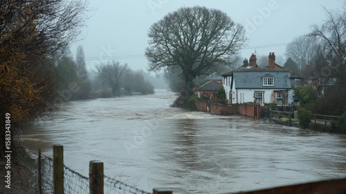 © Daphne, Fototapeta premium Flooded river overflows banks near cottage on overcast day