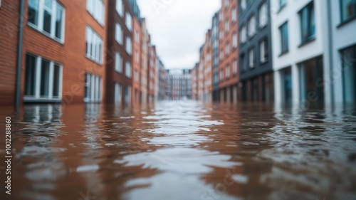 Fototapeta premium Flooded streets in a modern city, with water overtaking buildings, symbolizing extreme weather events and sea-level rise