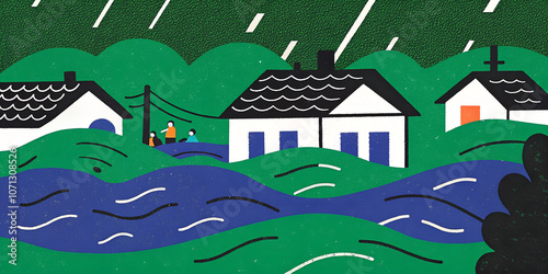 © inspiring , Naklejka premium Flooded Village During Heavy Rainstorm with Houses and Rising Water