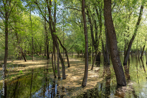 © Andrii Oleksiienko, Fototapeta premium Flooded with river water wood near beach on sunny spring morning. Horizontal color photography.
