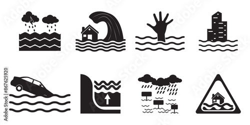Fototapeta premium Flooding icon set. Flat monochrome icons set of various types of natural disasters, Various hazards caused due to heavy rainfall. vector,