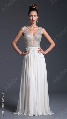 © Arceli, Fototapeta premium Floor length chiffon dress diamond embellishments deep V neck white background