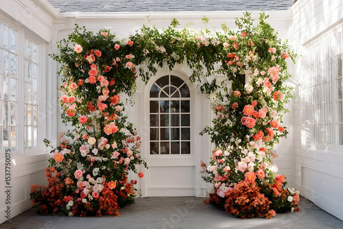 © Muhammad, Fototapeta premium Floral archway adorned with vibrant roses and greenery.