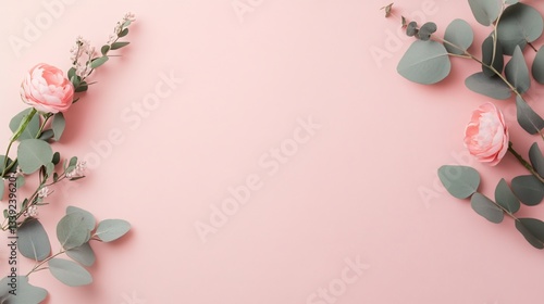 © Wannapha, Fototapeta premium Floral arrangement on soft pink backdrop, vibrant greenery and blossoms framing a blank space for text or design.