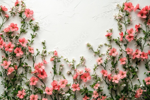 Fototapeta premium Floral arrangement showcasing pink blossoms against a textured white...