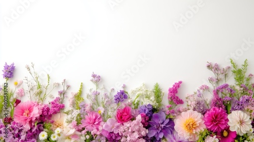 © Giman, Naklejka premium Floral Arrangement Wildflowers Botanical Bright Style High-Resolution Horizontal Border Composition Delicate Blooms White Background Pastel Spring Tones Ideal for Wedding Invitations