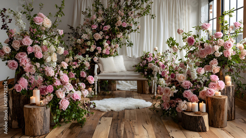 © Swaha, Obraz premium Floral arrangement with bench and candles in a room.