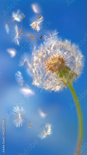 © barinovalena, Naklejka premium floral background with white fluffy dandelion flowers on blue background