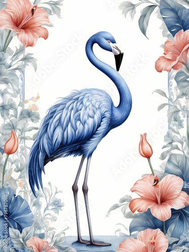 © Dmitry, Fototapeta premium Floral blue flamingo painting generative AI illustration