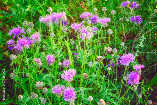 © Anatoliy, Naklejka premium Floral blue-violet background. Pink thorny thistle flower.