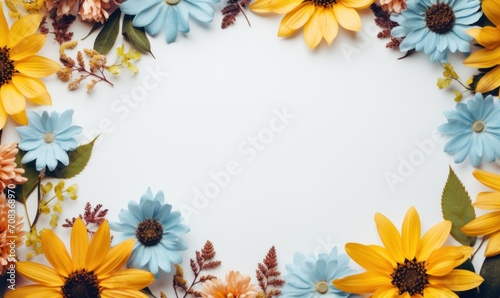 Obraz premium Floral border frame, assorted garden flowers empty space background. Backdrop with copy space