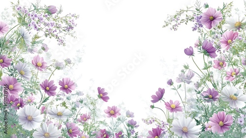© Asrianto, Fototapeta premium Floral border of cosmos in bloom with soft greens; a background for text/design