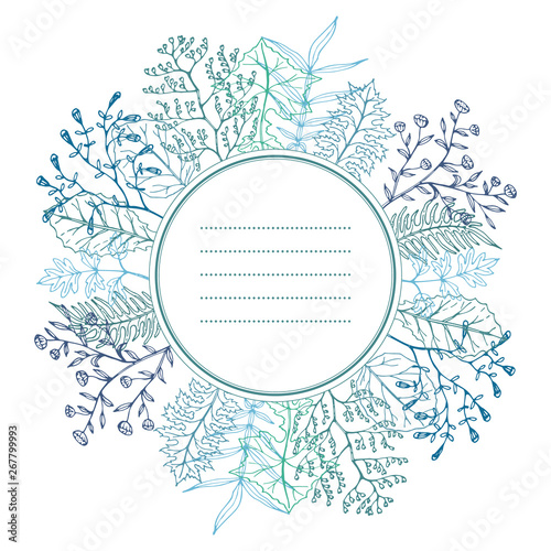 Obraz premium Floral card with herbal, twigs, leaves and branches wreath.